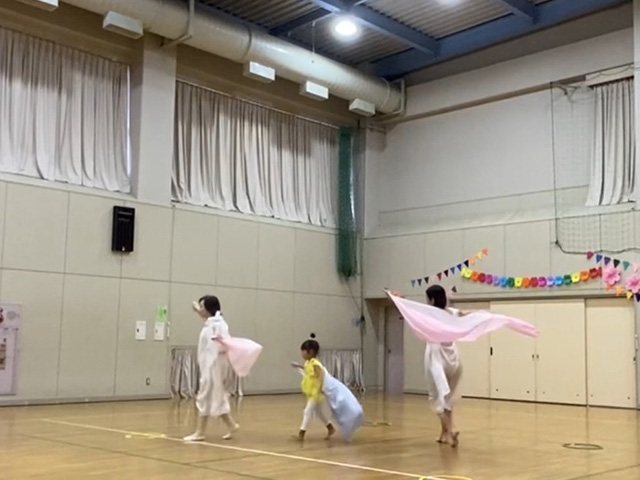 一年生の「くじら雲」ワークショップでは、一年生が、自由にスカーフを動かして、雲を表現する様子に感動しました。化繊で、