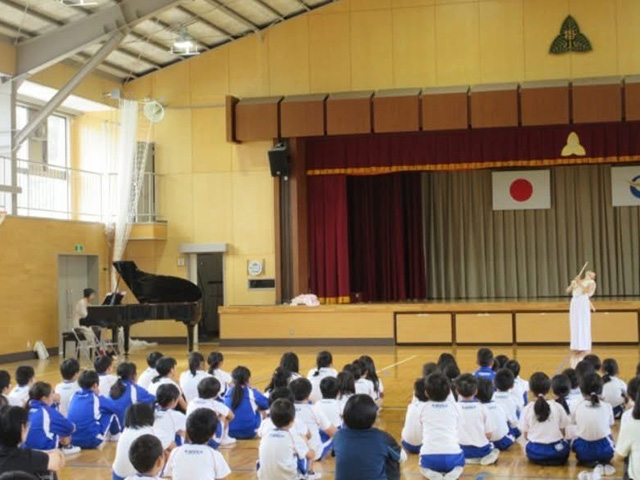 福島県伊達市掛田小学校にて、ピアニスト吉岡優子さんと共に、「狩り」「ブラームス・ワルツ集」と、